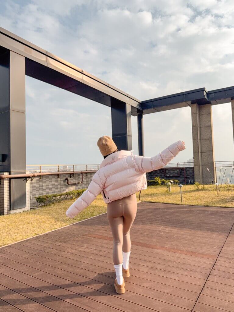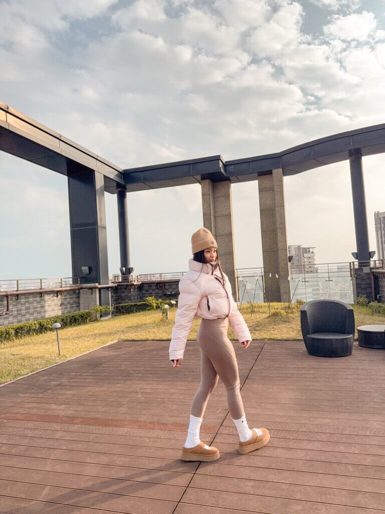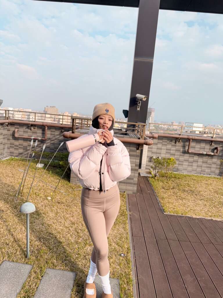 • 我覺得短版羽絨外套和瑜伽長褲(Leggings)是天生一對!視覺上超級拉長腿部比例。搭配咖啡色下半身可以稍微耐髒一點,去健身房時裡面直接穿運動內衣,穿脫超級方便。我也很喜歡那種「要穿好不穿好」的感覺,讓外套自然落在肩上,隨興又好看。