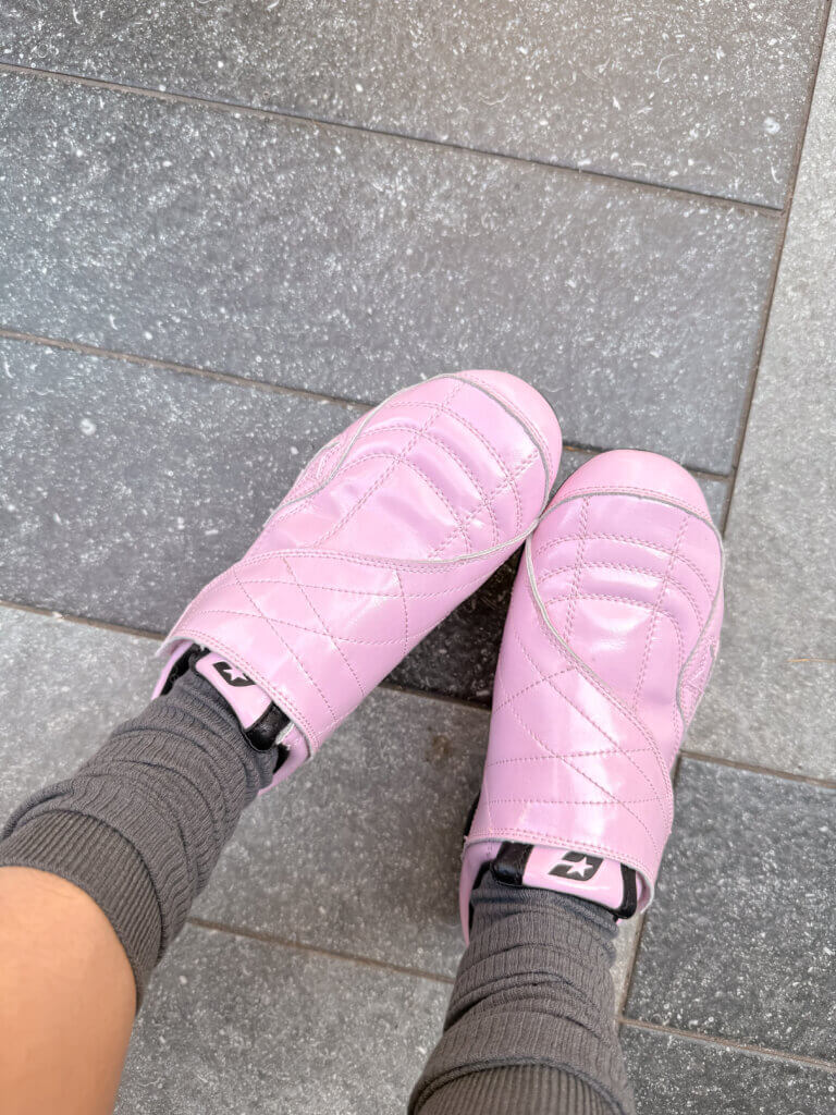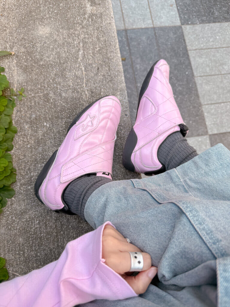 The stitching details and the signature star logo on the side are so cute. When I wear them with long pants, just the little pink toe peeks out, but they look even better with a mini skirt.