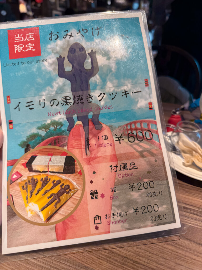 Yes, it looks exactly like the “delicacy” the frog spirits go crazy for in Spirited Away. It’s actually just a crunchy, slightly sweet biscuit, but the shape is 100% lizard. At 600 yen, it’s the ultimate “IYKYK” gift for Ghibli fans.