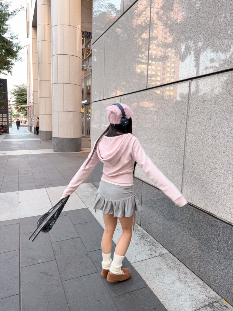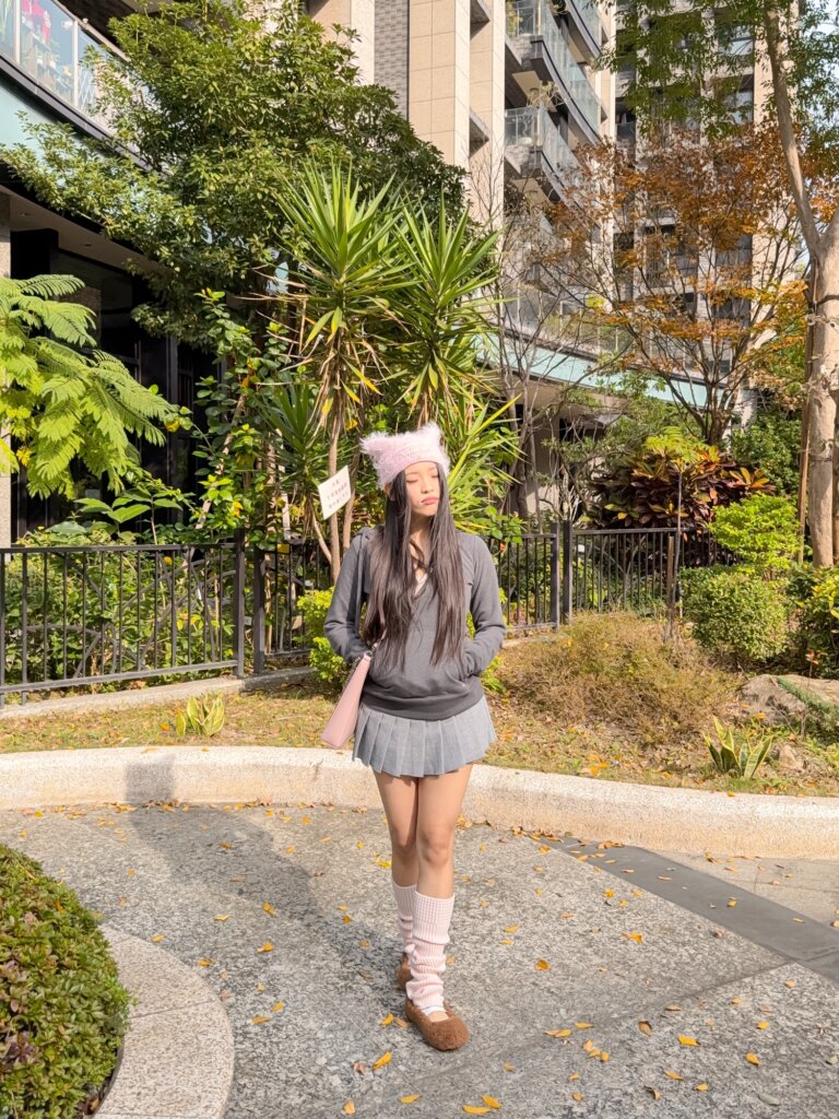 I am currently in my “cat-ear hat” era. I paired a pink one with a grey/pink color palette for a look that’s super soft and feminine.