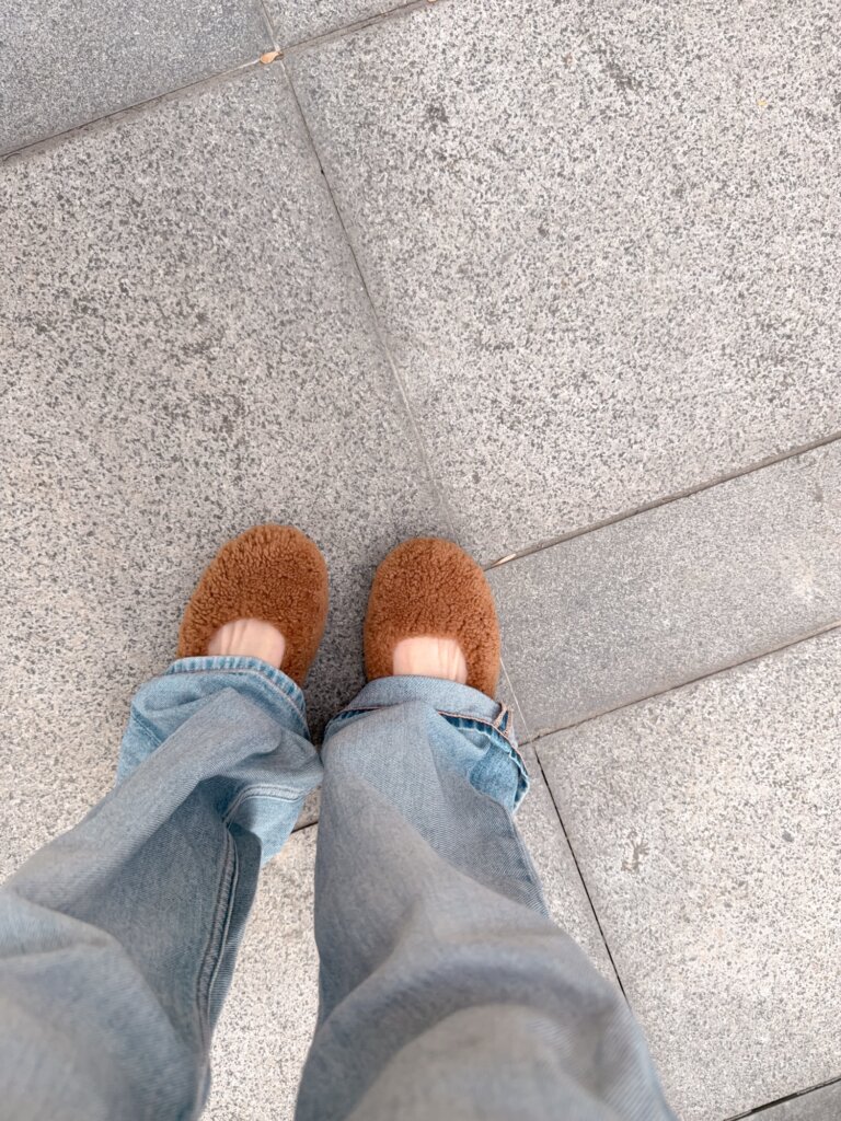 Okay, if you look from a certain angle, do they look a bit puffier than a standard leather flat? Yes. But that’s the point! It’s that “Moon Boot” chunky-cute aesthetic. The ribbon across the top helps break up the fuzziness so they don’t look like actual slippers. I find the “clunky-but-dainty” look super endearing.