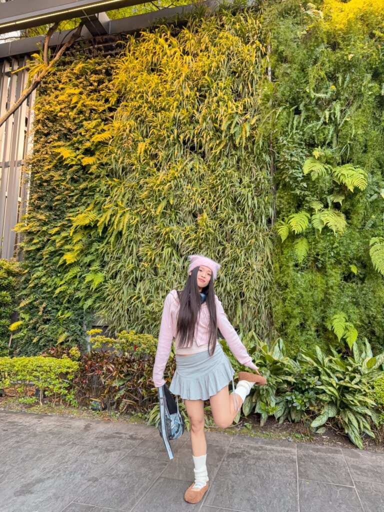 For the bottom, I chose a pleated skort with side drawstrings to lean into that Balletcore aesthetic. I’ve been wearing this skirt since last summer, and it transitions perfectly! Add some slouchy leg warmers, a denim patchwork bag, and some chunky headphones, and you’ve got that playful, Y2K “main character” energy.
