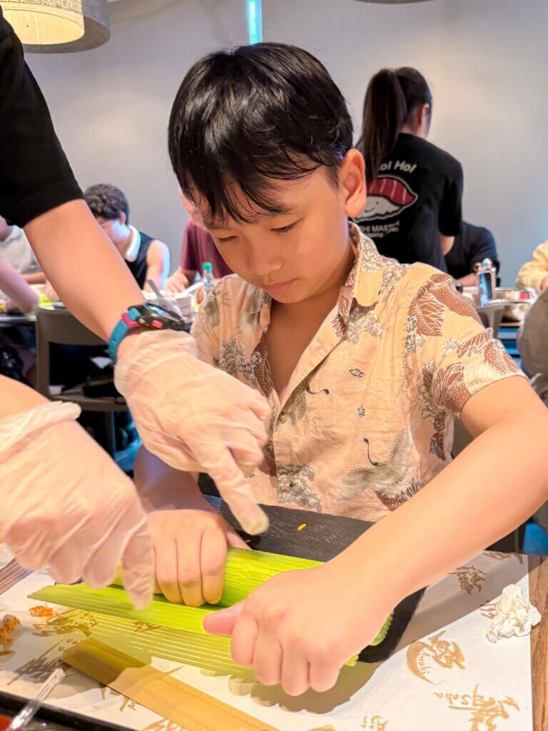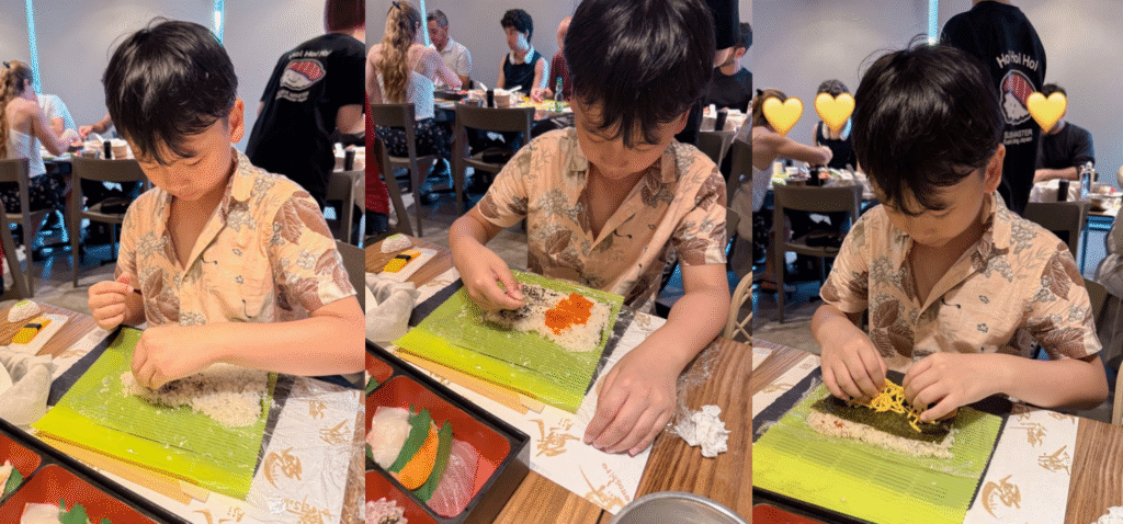 Who knew there was such a specific science to nigiri? It’s not just squeezing rice into a ball 😆! There’s a rhythm to the finger movements and a specific “tuck and roll” technique. Hardy got into the zone, whispering the steps to himself and mimicking the instructor’s hand shapes. When he finally placed his perfect piece of nigiri down, the teacher gave him a massive thumbs-up! This is exactly why I recommend this place—they don’t just teach you how to cook; they really know how to boost a kid’s confidence ✨