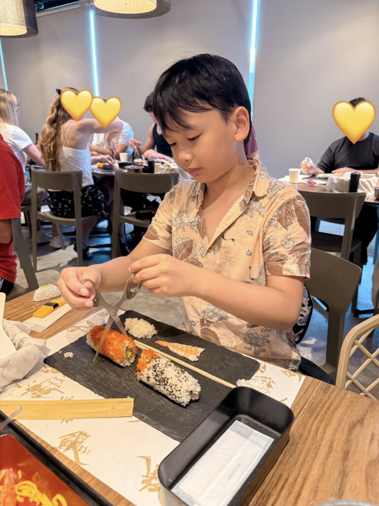 Then… disaster struck. Hardy made the first cut with the scissors quite bravely, but because he didn’t have enough grip strength to keep the roll compressed, his beautiful sushi just “deconstructed” itself on the plate. I saw the older kids and adults at the next table succeeding, and Hardy looked a little heartbroken for a second.