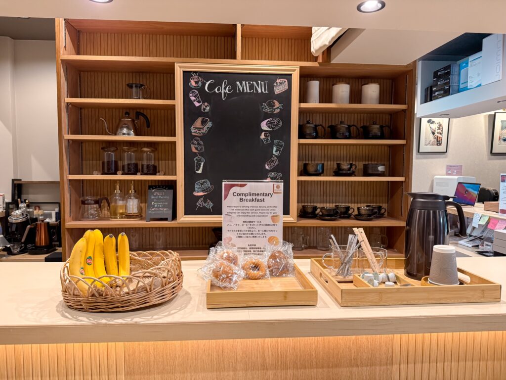 The lobby? Cozy and welcoming. There’s free coffee, snacks, and even bananas 🍌 (rare to find fruit in Japanese hotels, so this was such a thoughtful touch).