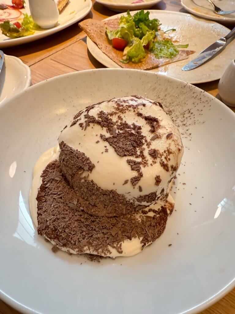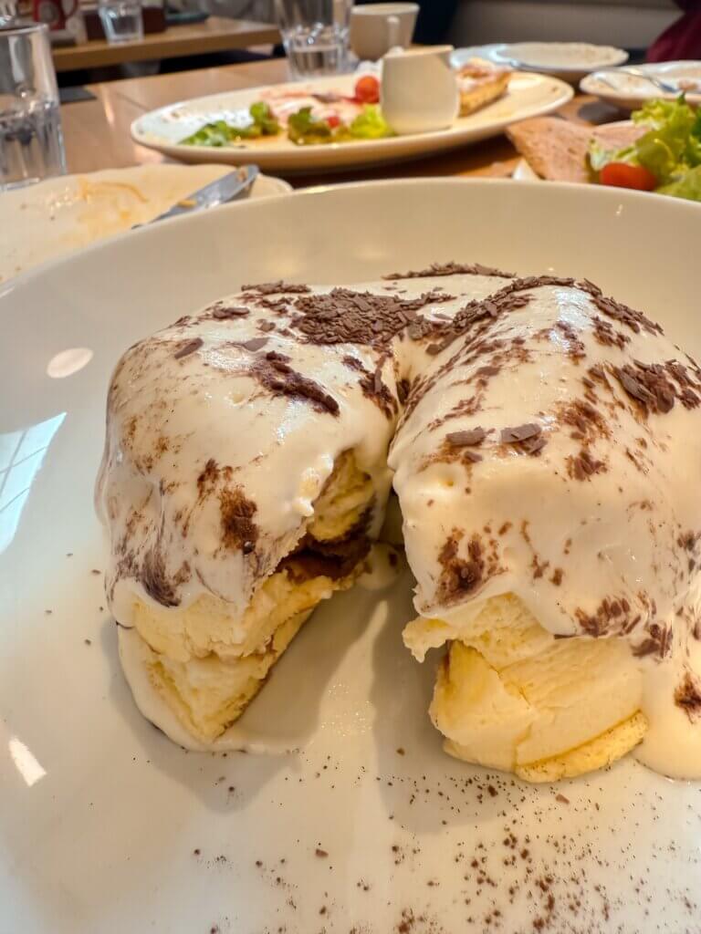 這道鬆餅完美詮釋了什麼叫做「空氣感」!舒芙蕾的邊緣帶著一絲輕微的焦脆,但中心點根本不需要咀嚼,輕輕一碰就化開了,馬斯卡彭乳酪帶來的是一種紮實乳香甜味,厚厚地覆蓋在鬆餅上,就像是被奶香溫柔地包圍,上面的巧克力碎屑與苦甜可可粉,剛好中和了乳酪的甜膩,每一口都好幸福~