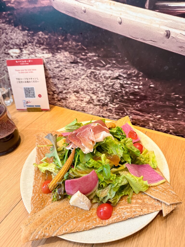 這是我第一次試法式鹹薄餅(Galette)。完全是友人指定要點的(好眼光),餅皮帶著蕎麥的香氣,比一般的可麗餅更脆、更有嚼勁。