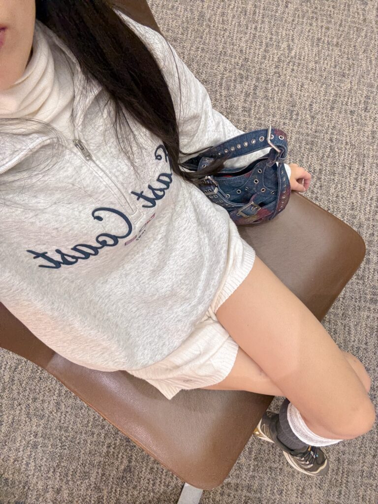 Under the jacket, I had a sparkly bright pink sweater, which was honestly a fun hidden detail. But visually, the outfit was all about the puffer + pants shape.